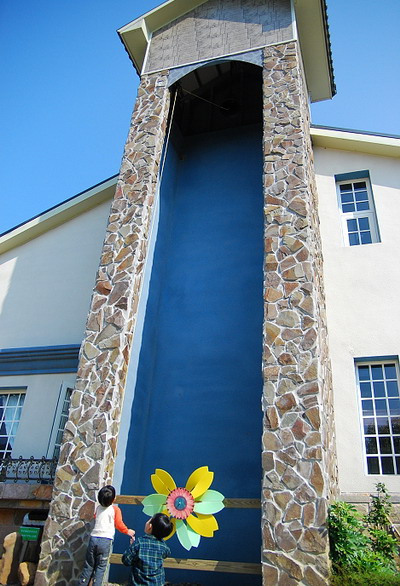 ● 在全家人天馬行空東拼西湊的設計下呈現目前的外貌,外觀採歐式建築,仿照教堂的設計元素,一磚一瓦皆由全家人一同參與構築,顏色搭配藍白色調讓人倍感輕鬆,有一種很輕鬆悠閒的感覺;外觀特別的地方在入口處的鐘樓高有八米多,週邊山林綠野的搭襯讓鐘樓充滿遐想,您可以想像山中深處傳來的陣陣鐘聲,聽起來是清脆悅耳、您也可以親自來敲響「幸福鐘聲」將幸福傳遞給遠方的朋友…